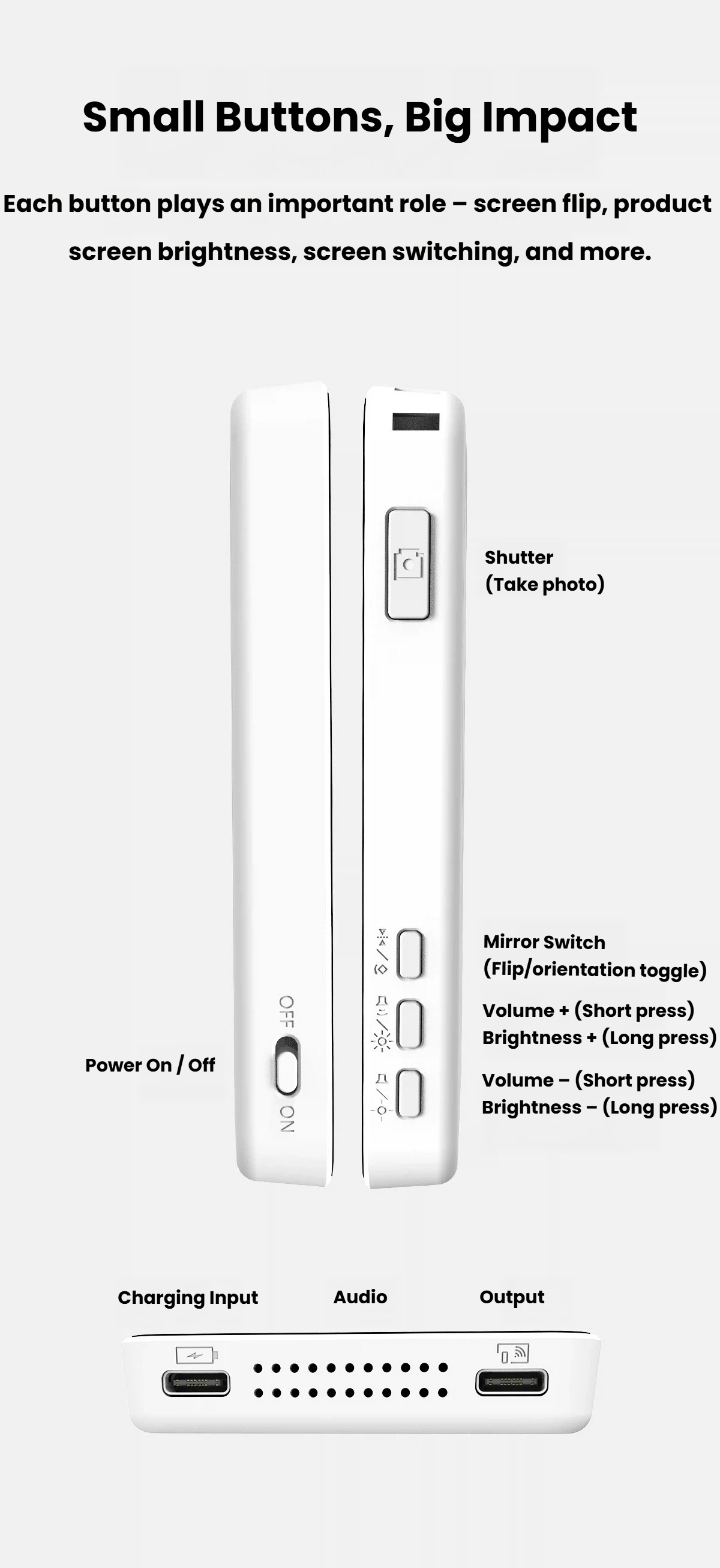 Physical buttons give you quick access to essential functions: shutter, mirror flip, volume, and brightness. Adjust zoom and aspect ratios directly from the remote screen without touching your phone. With three frame options — full screen, stretch, and zoom — you can compose for TikTok, Instagram, or YouTube without guessing or cropping later. Every button is placed for intuitive one-handed operation, so you stay focused on your subject, not your gear.